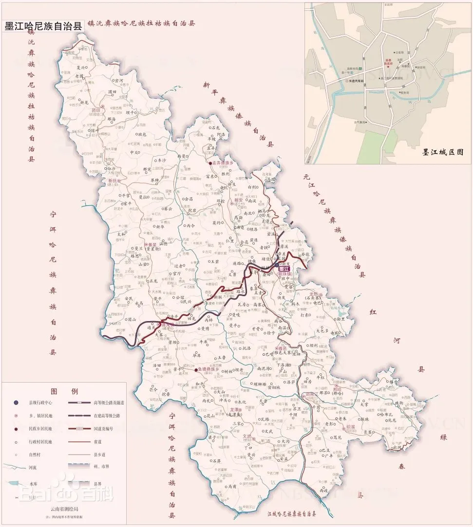 - 墨江哈尼族自治县原名他郎,民国四年(1915年)改称墨江县,以纵贯县内阿墨江得名,寓意“流墨成江”。