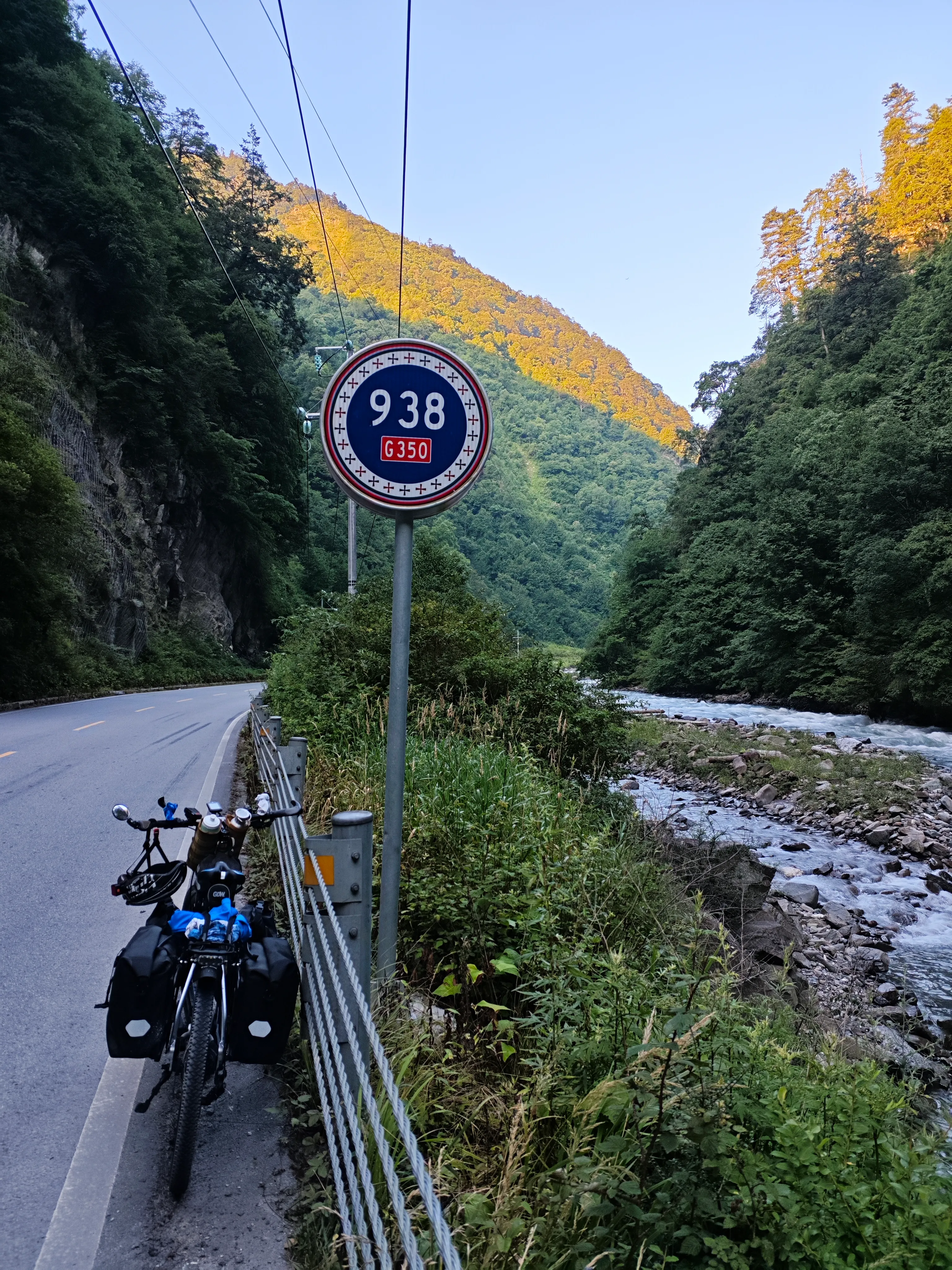 从熊猫沟出来一直沿着河骑行,时不时能看到日照金山。清晨骑行路上车很少。我还碰到了三个老头骑友,我估计他们骑的是电助力自行车,飞快的超过了我。