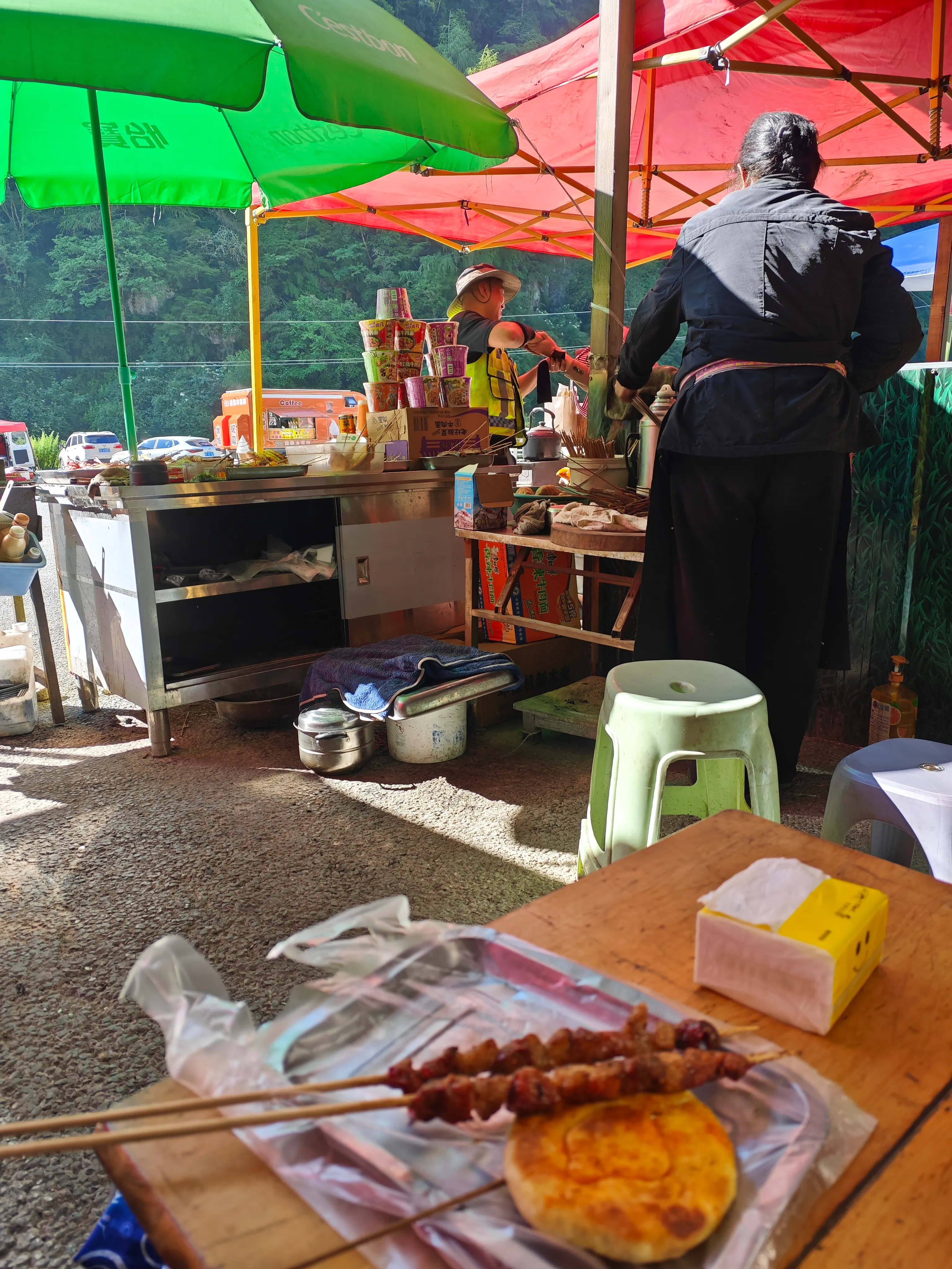 我妥协了,打烧烤摊主打听打车的价格,摊主自己就有车,原来这一路,从驴驴店,贝母坪到这里,都是熊猫沟的村民在做生意。她咬定100块钱不肯让。在我看来,下去6公里,过隧道8公里,再算上来回也就是28公里。考虑车多,最多也就一个小时搞定吧,这价格高了点。但我又能有什么选择呢?