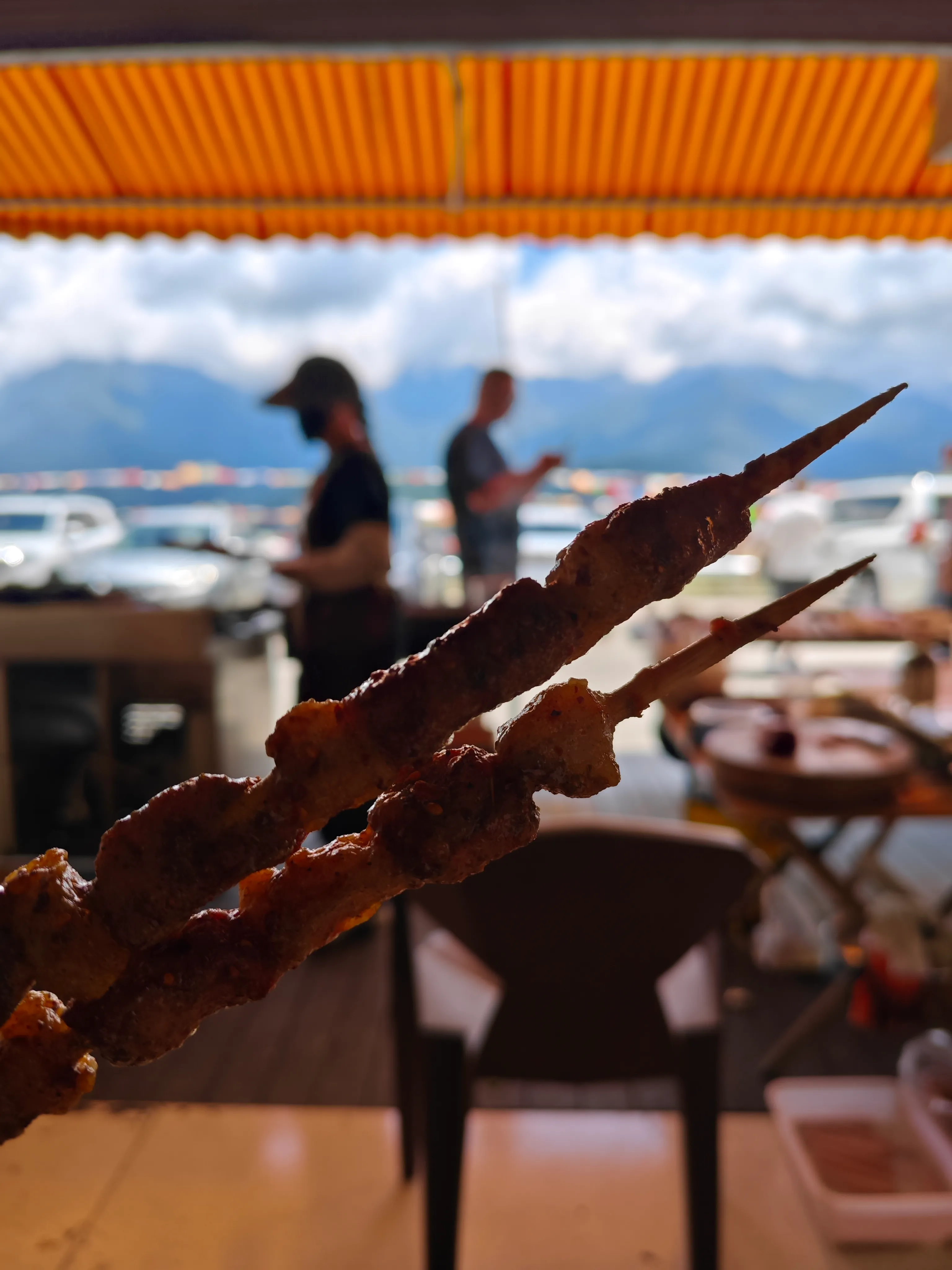 快到邓生的之前,有个叫驴驴店的地方,这里是个早餐点。我昨天还不知道这个情况。这里有一排摊位,卖的东西也差不多,烤肉串为主。我吃了两串肉,也不知道什么肉,6元一串,一个青稞饼子,5元。