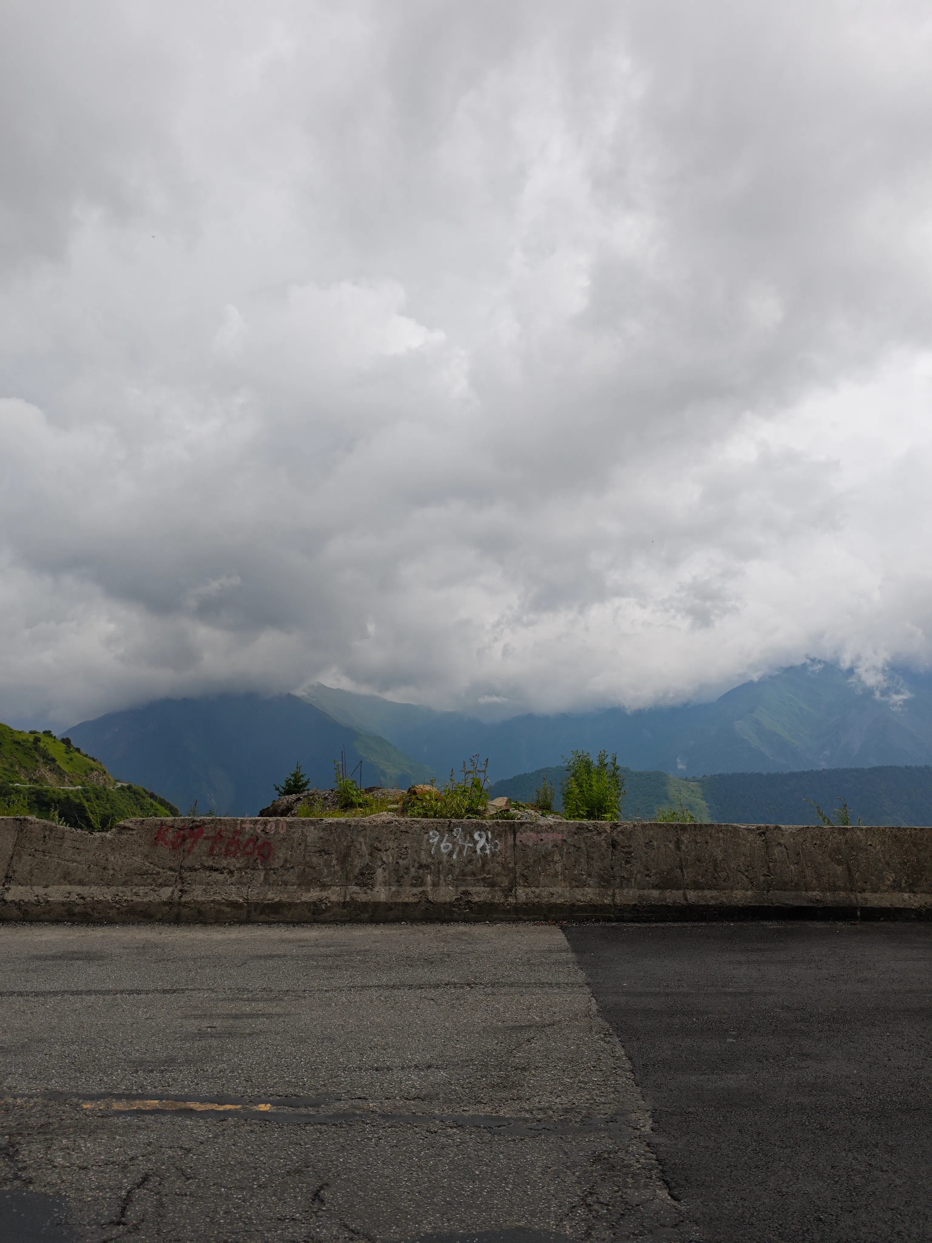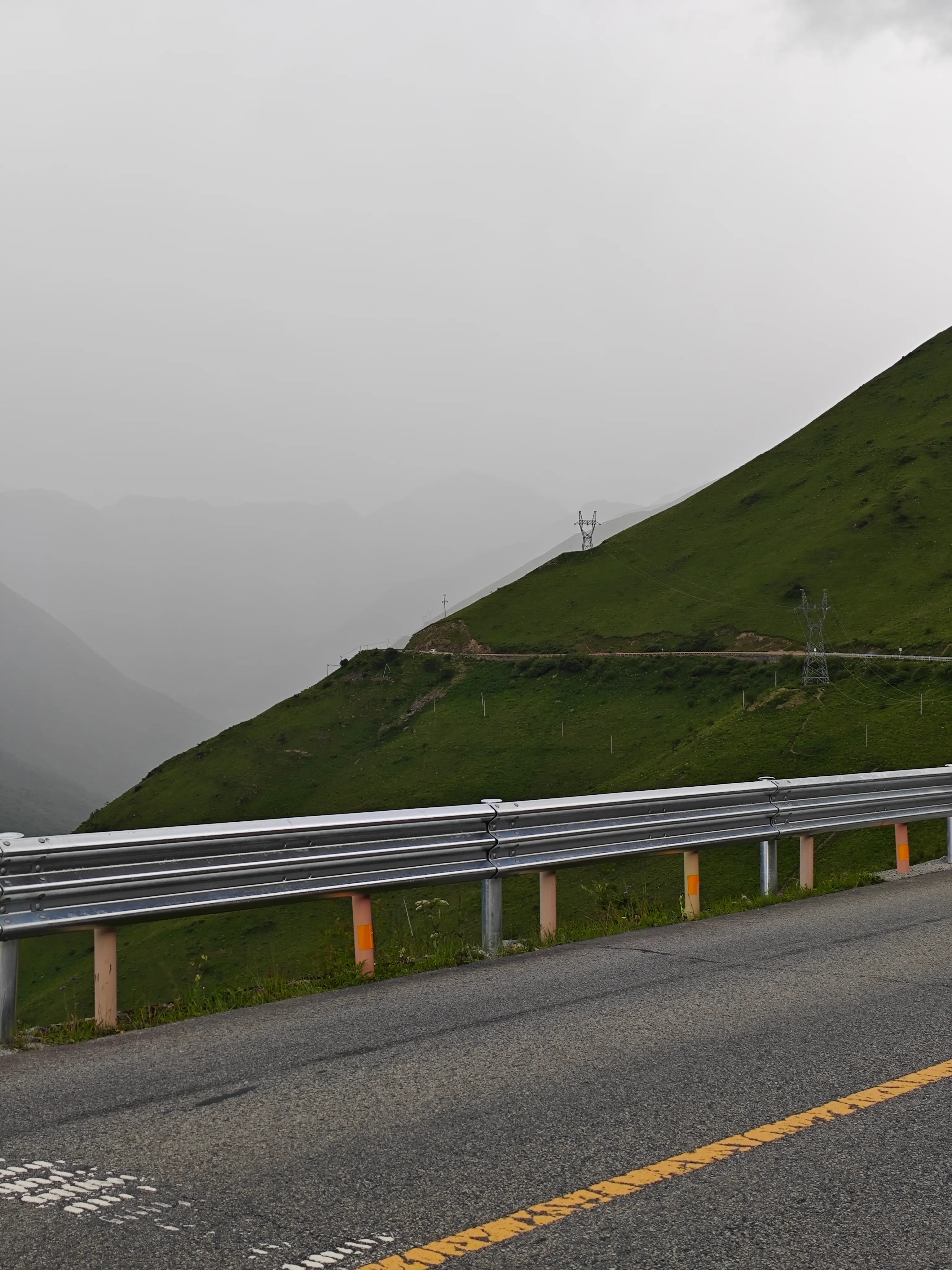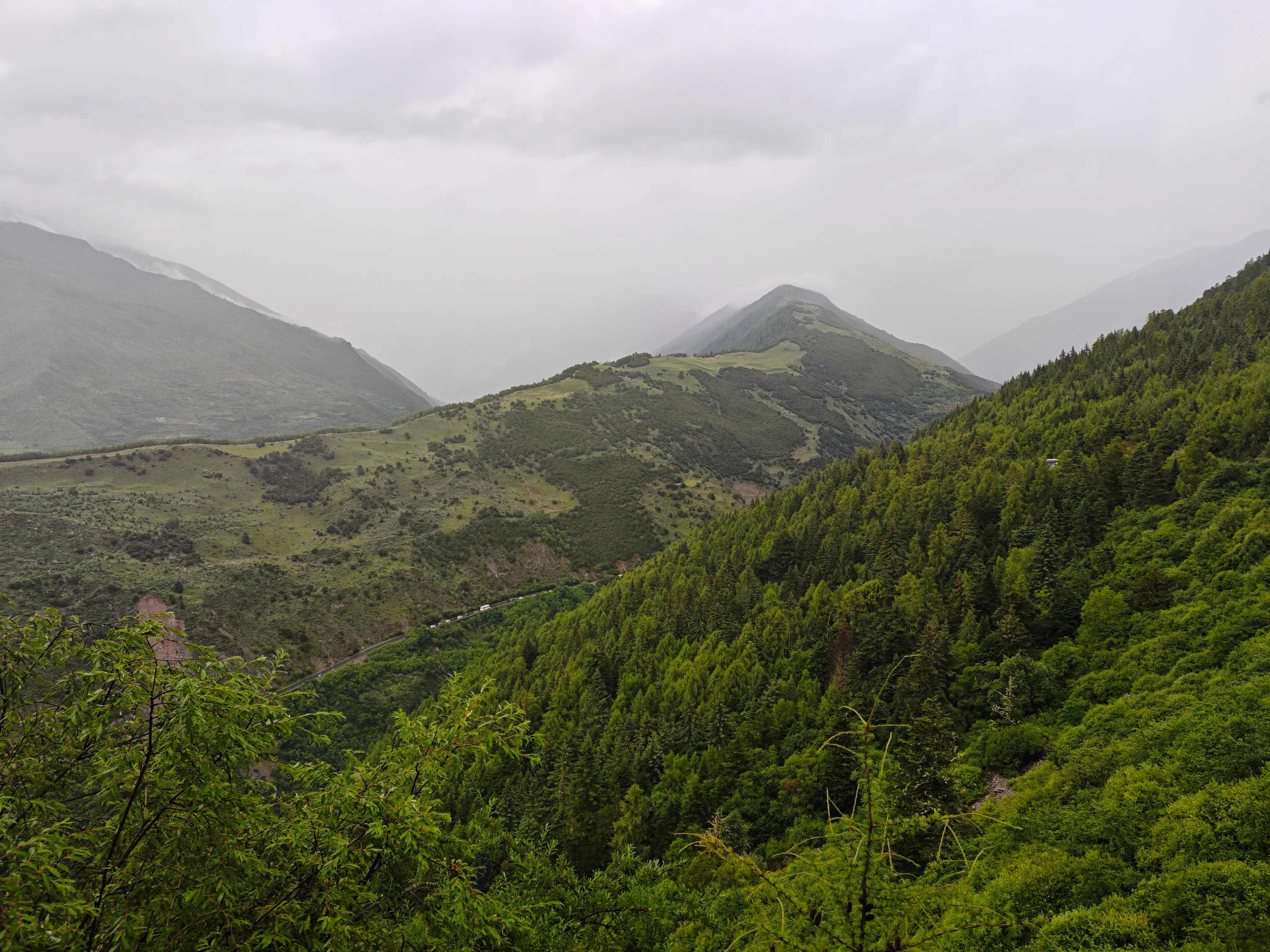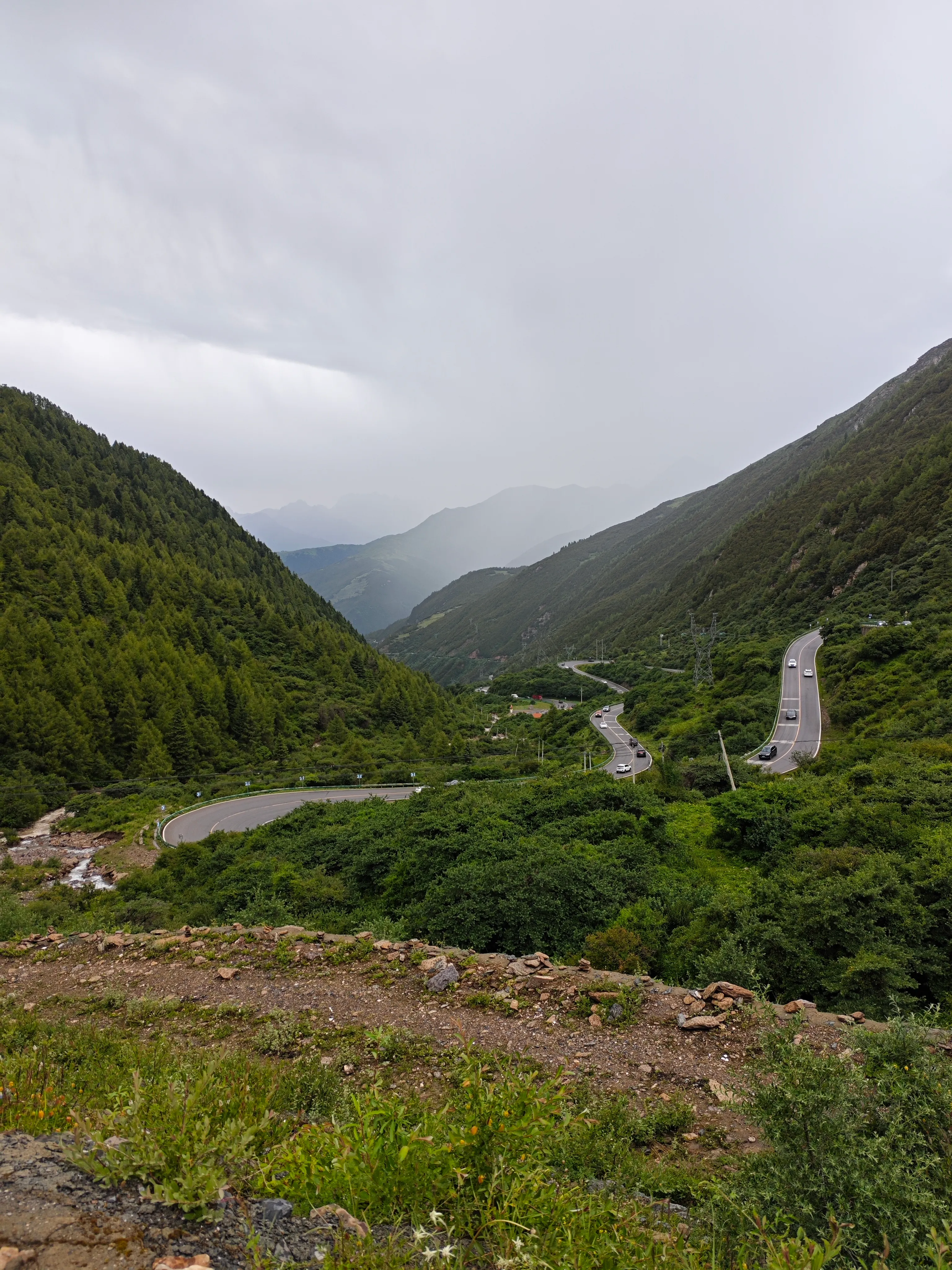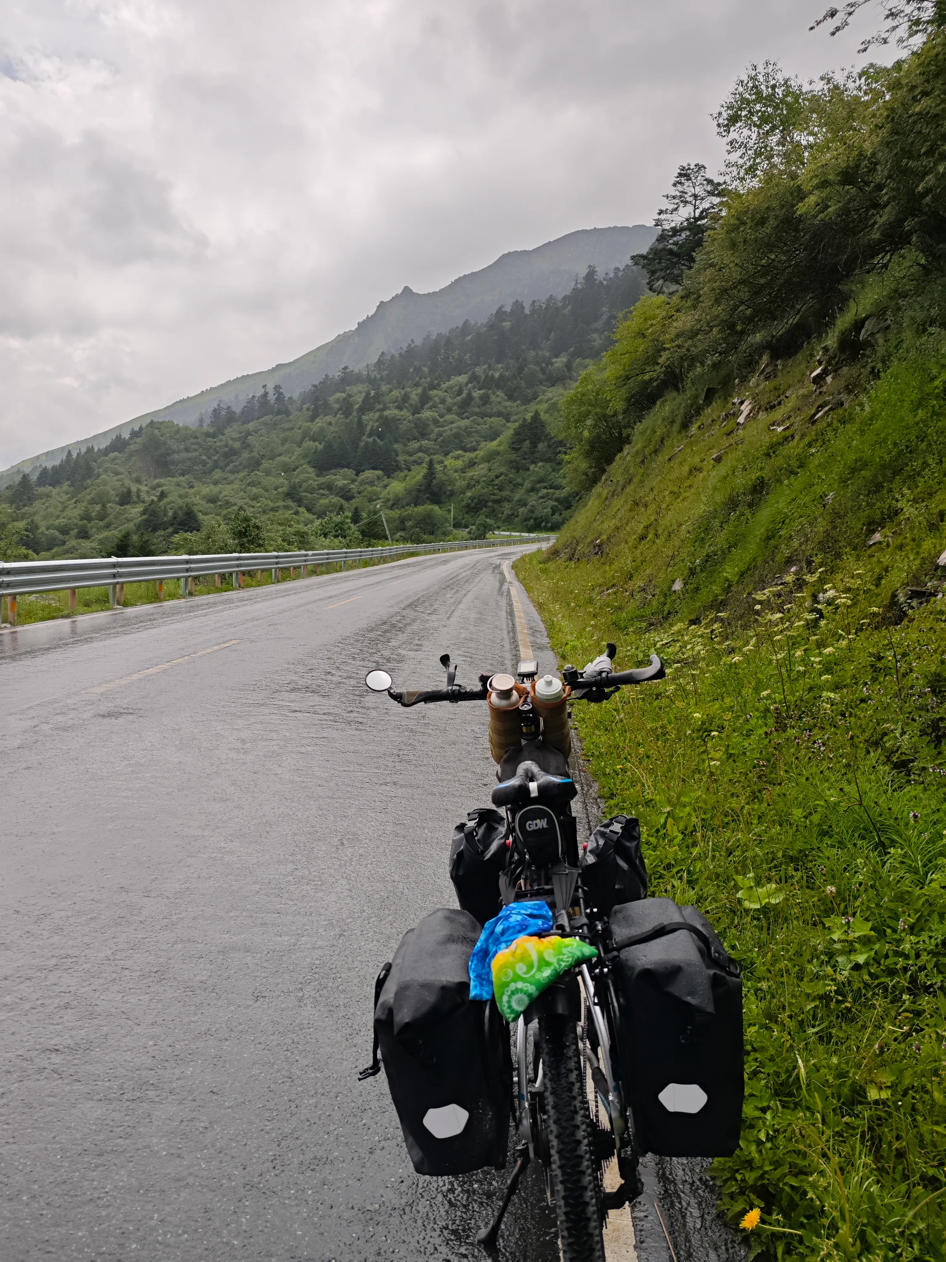 过了隧道,大约下午5点。如果天气好,剩下的路程是下降600多米到四姑娘山镇。这仍然能算是美好的一天。只是如果有坏事,那坏事一定来,墨菲定律。我刚穿好软壳,厚裤子,准备看看有什么风景。隧道这一边也开始下雨了!赶紧拍一张也许有某个姑娘的山的照片就往下骑,指望着能在雨下大之前到四姑娘山。