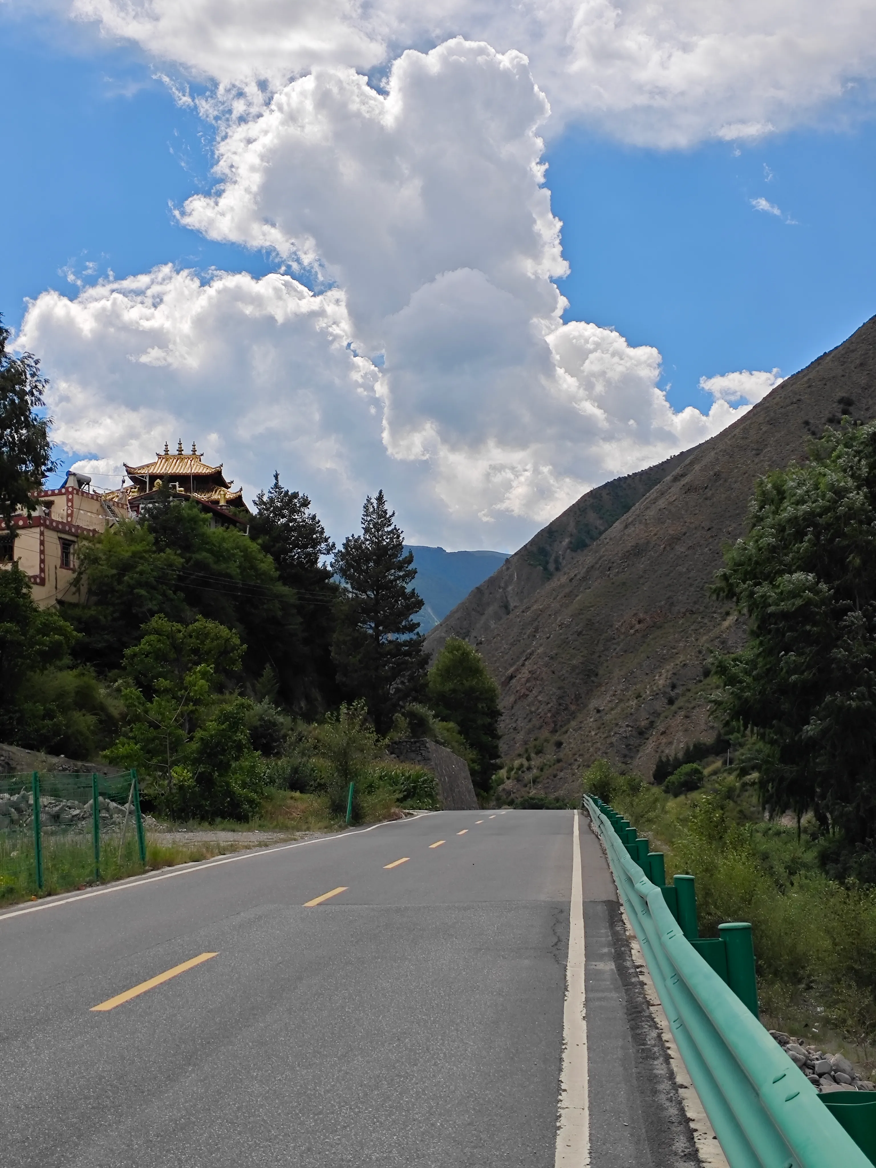 靠近丹巴了,不时会看到金色的屋顶,没有特意骑上去看,估计是寺庙。今天运气还行,下午三四点后,天 上的云多了起来,不时还能阴下来几分钟。