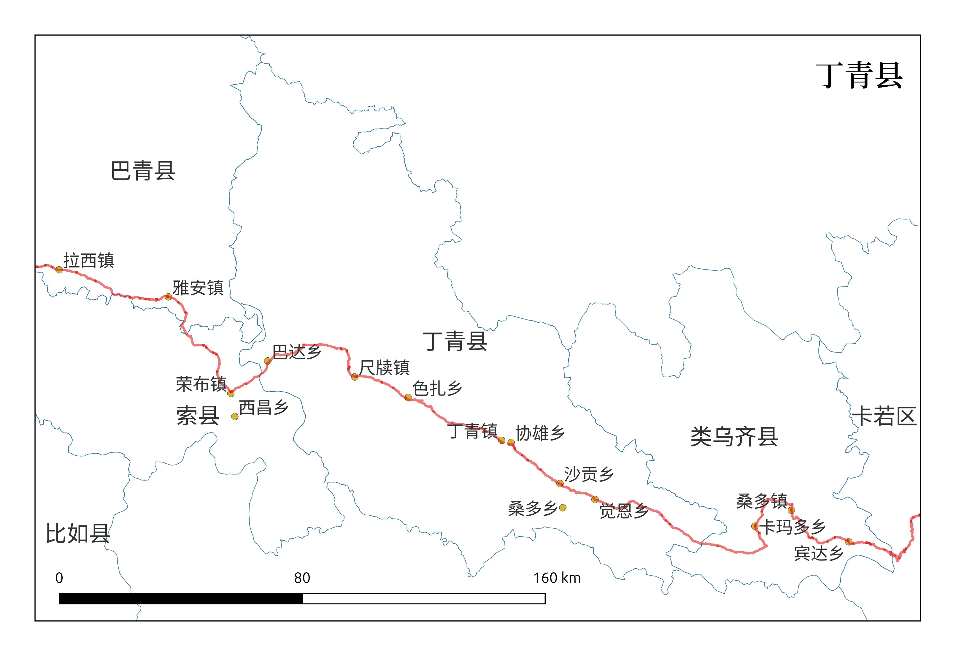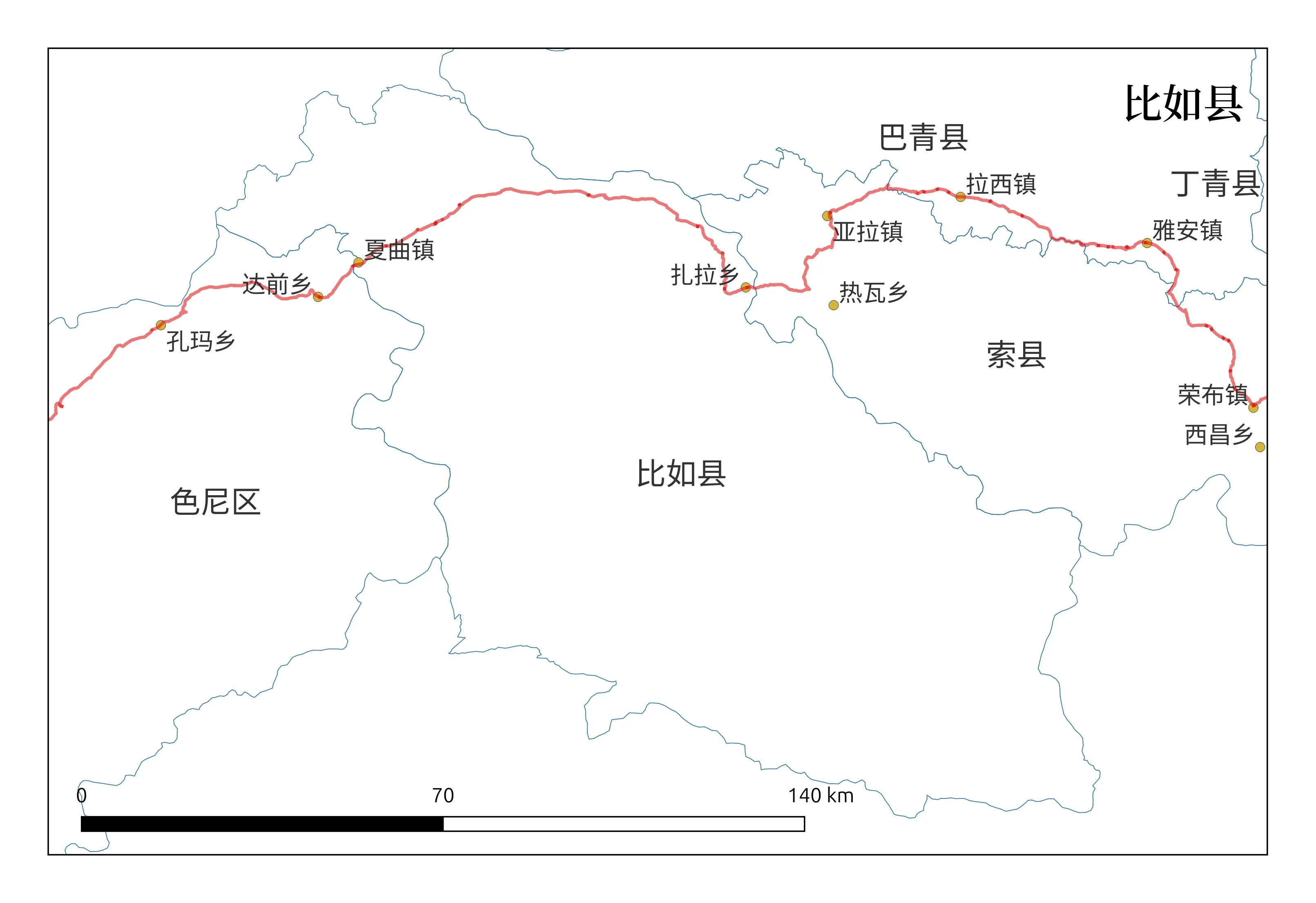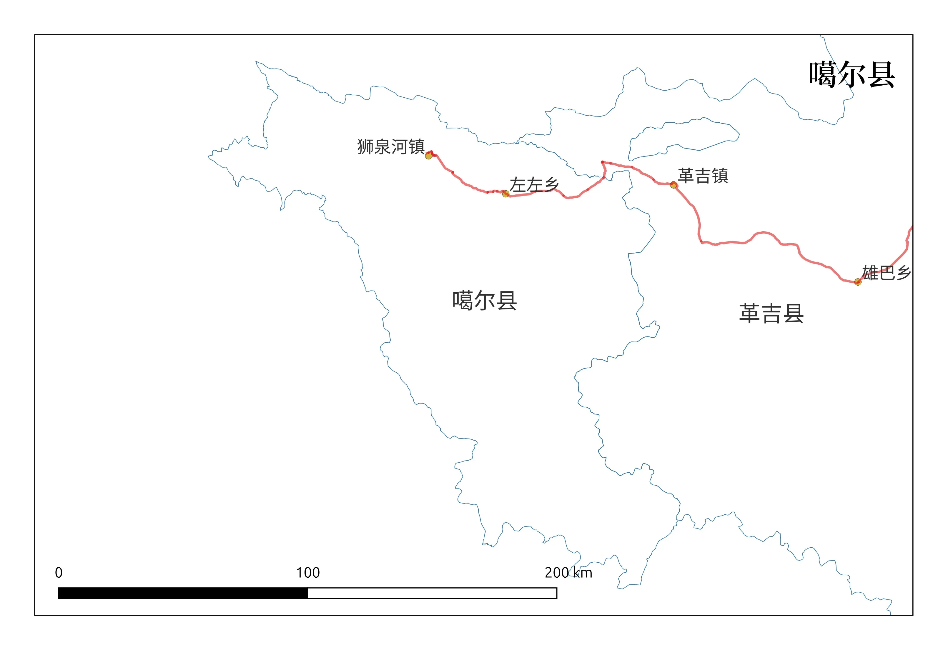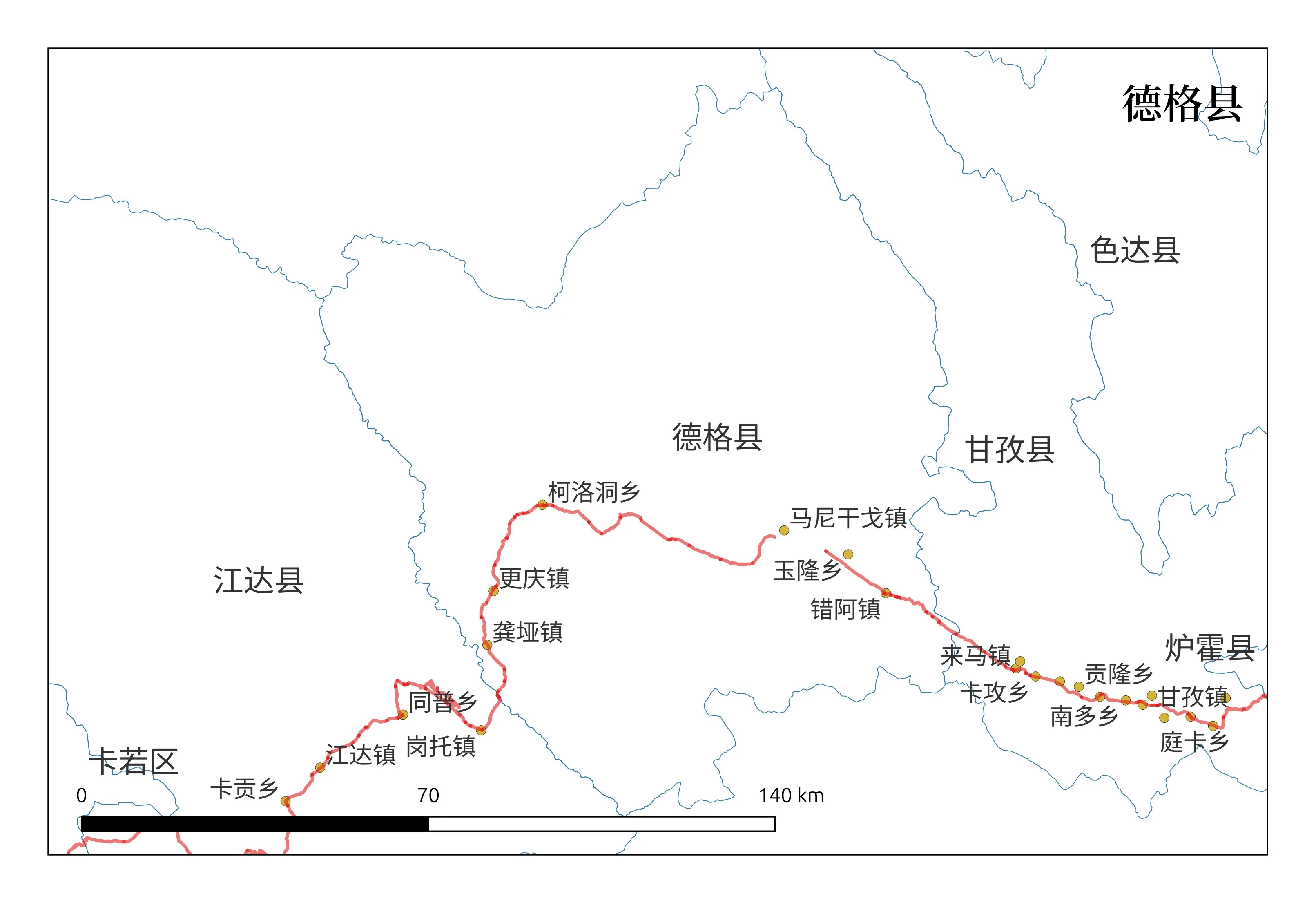 以下是按用qgis选择了路线10公里内的乡镇名称。在地图上,乡镇名称一般会标在乡镇的中心,一般也是最繁华的区域,但也不绝对。可以做为重要的参考。